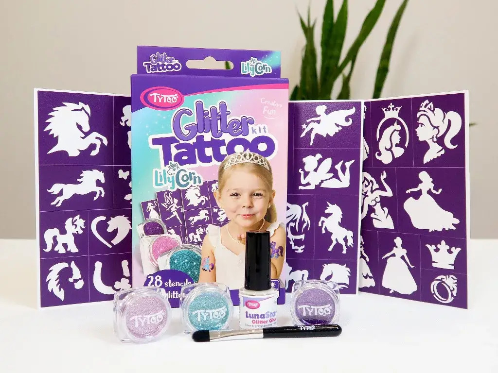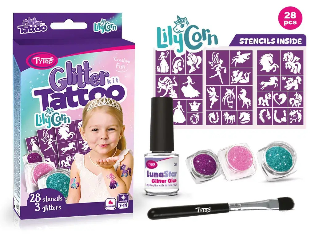 Csillámtetoválás LilyCorn szett (28 sablon, 3 csillámpor, 5 ml ragasztó, ecset)