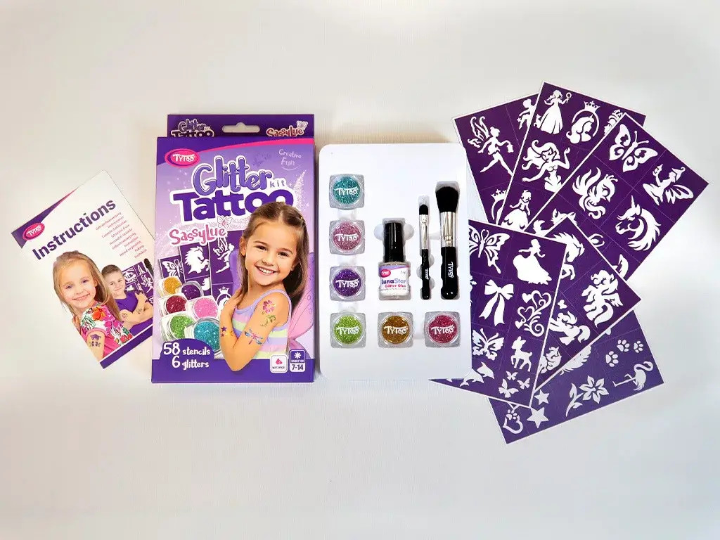 A SassyLue Csillámtetoválás Szett a csillogás, a stílus és a varázslat tökéletes kombinációja. Ez az extra nagy, 58 sablonos készlet a tündérek, unikornisok és pillangók rajongóinak készült – azoknak a gyerekeknek, akik szeretnek ragyogni és szabadon alkotni.