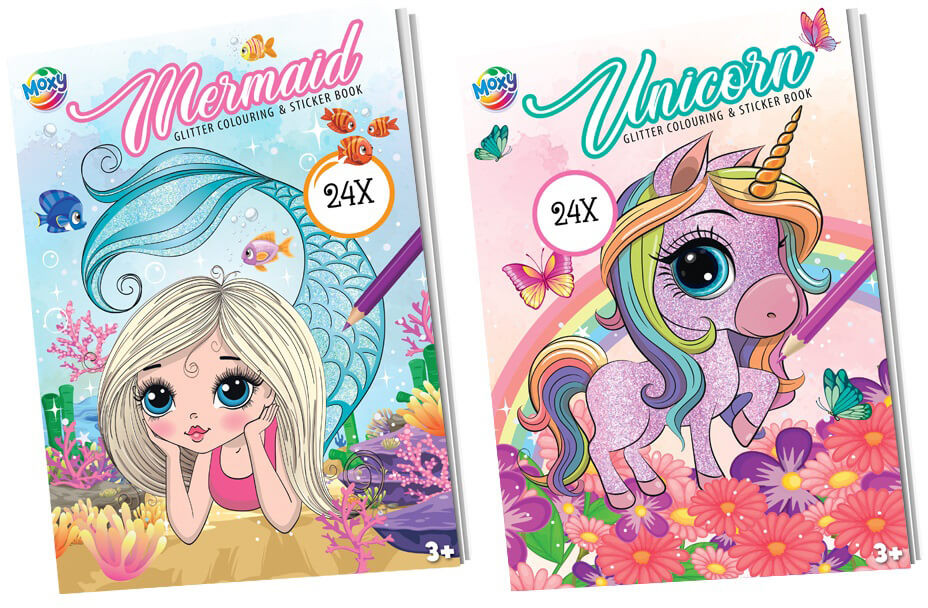 Glitteres színezőfüzet, A/4, 24 oldal, 2 ív matrica, kétféle változat (hableány, unikornis)