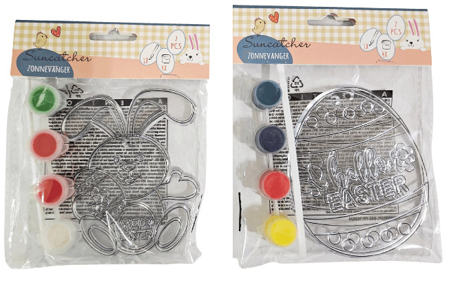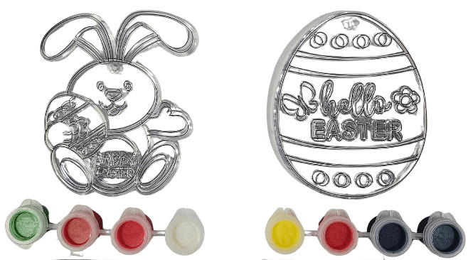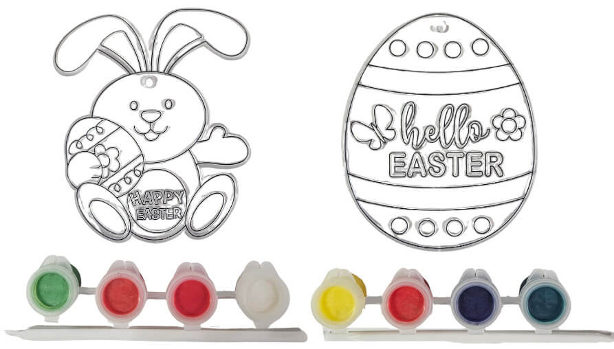 Húsvéti kreatív szett, festhető műanyag függődísz, húsvéti nyuszi vagy tojás, 2 db/csomag, kétféle. AZ ár egy csomagra vonatkozik, amely 2 db egyforma sablont és festéket tartalmaz. A sablon mérete kb. 9x11cm.
