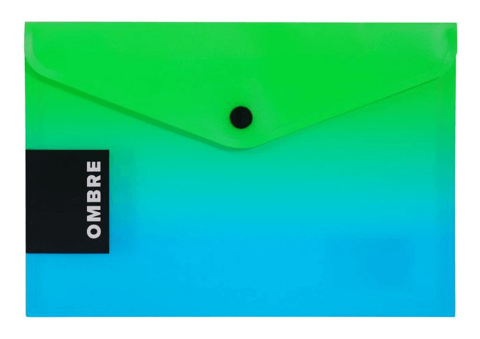 Irattartó tasak A/5, patentos, műanyag, OMBRE, zöld-kék. Elegáns és praktikus, levél alakú boríték, kiváló minőségű polipropilénből, ideális társ dokumentumai biztonságos szállításához és tárolásához. A patentzár biztosítja a boríték biztonságos záródását. A5-ös méret. Méret: 250x180mm