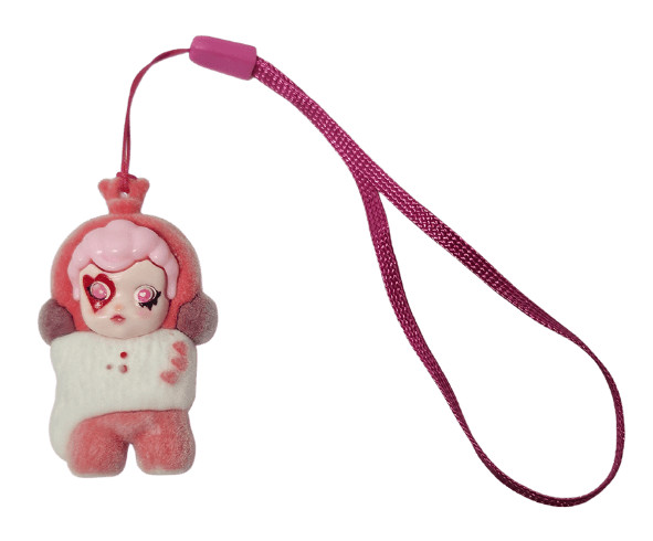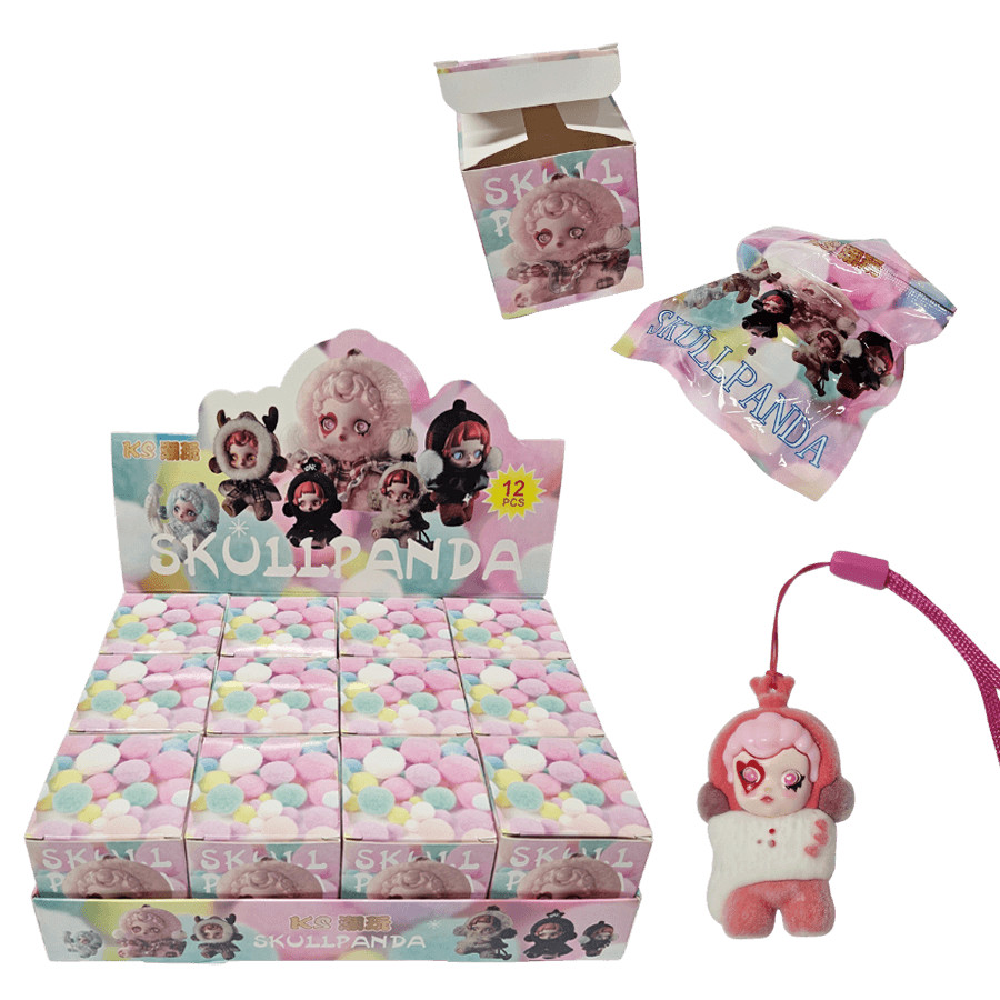 Meglepetés mini plüss plüssfigura, Skullpanda design, akasztóval, kb. 4,5x2,5cm. Zsákbamacska
