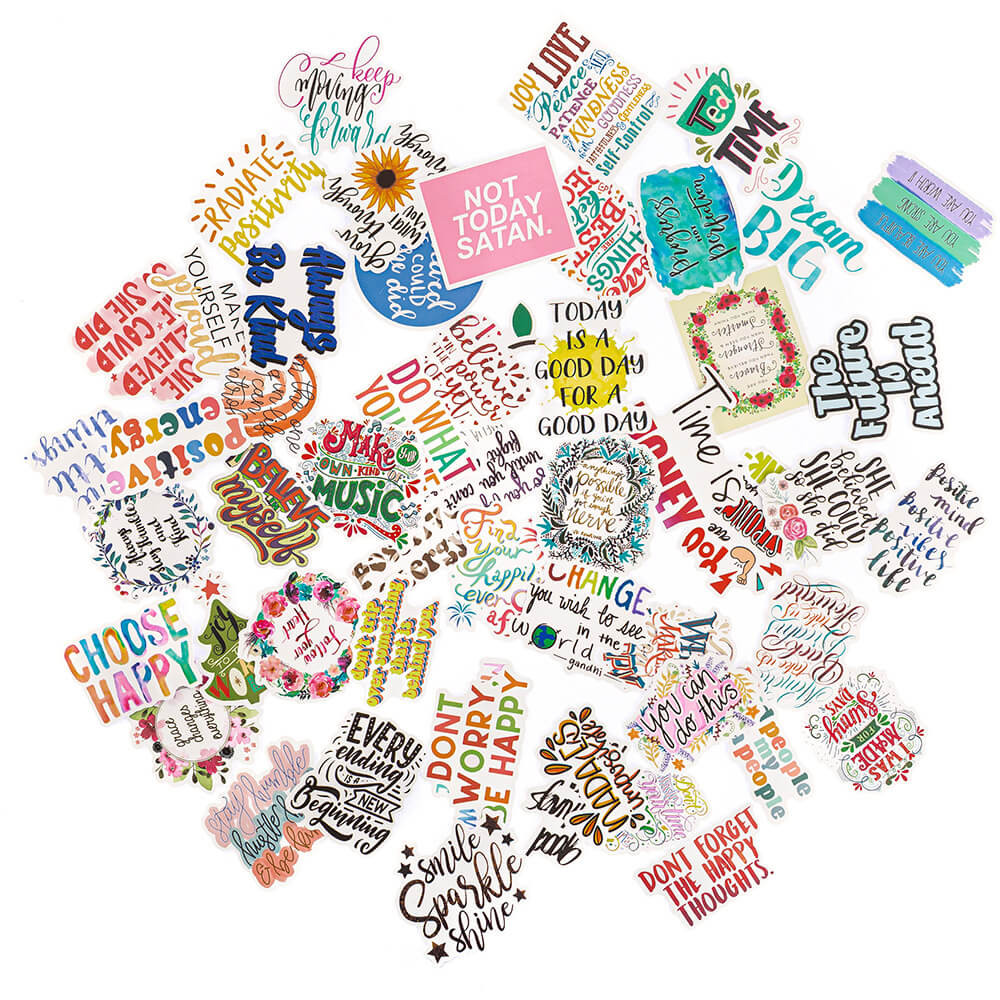 Motivációs matricakészlet, vinyl, 5,8cm, 50 db/csomag, világos színek. A matricán inspiráló mondatok találhatók, amelyek arra emlékeztetnek minket, hogy maradjunk pozitívak és folyamatosan törekedjünk a személyes fejlődésre.