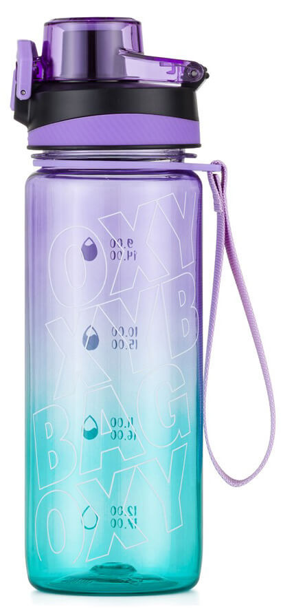 Oxybag kulacs, 800 ml, BPA mentes, OXY Life motivációs kulacs, Ombre Azur, türkiz-lila. Méret: 74*74*245 mm, Súly: 160 g Az OXY Life 800 ml-es Tritan kulacs élénk színekben és stílusos nyomtatásban praktikus kiegészítő a mindennapi hidratáláshoz. A hátulján egy ivási rendszer skála található, amely segít fenntartani az egészséges életmódot. A kulacs zárral és felhajtható fogantyúval ellátott nyitómechanizmussal van felszerelve, amely biztosítja a könnyű nyitást és a biztonságos zárást a kiömlés veszélye nélkül. A kulacs nyakán egy fűzőlyuk található, amelynek színes pántja illeszkedik a kulacs fő színéhez, ami megkönnyíti a hordozást. A kulacs mosogatógépben mosható, maximum 80 °C-on. Figyelmeztetés: A kulacs nem szénsavas italokhoz készült.
