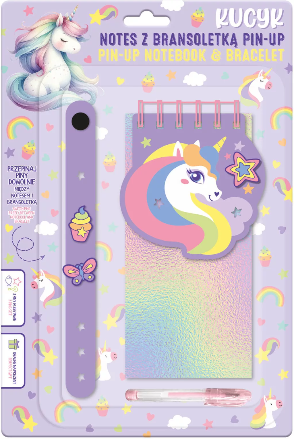 Spirálfüzet igazi unikornis rajongóknak! A készlet tartalmaz egy műanyag karkötőt, egy jegyzetfüzetet (8,5x17,5cm), egy tollat ​​és három díszítő formát. Mind a jegyzetfüzet borítóján, mind a karkötőn külön helyek találhatók a díszeknek. A charmokat szabadon cserélgetheted a jegyzetfüzet és a karkötő között, hogy saját, egyedi kompozíciókat készíthess. Ez a készlet tökéletes ajándék az unikornisok és a színes kiegészítők szerelmeseinek. A jegyzetfüzet belseje sima lapokkal rendelkezik, amelyek tökéletesek jegyzeteléshez, vázlatkészítéshez vagy fontos információk feljegyzéséhez.