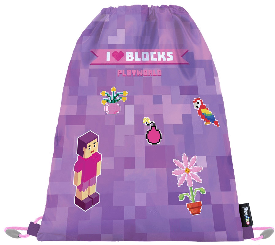 Minecraft mintás tornazsák 30x37cm, OXY, Playworld Girl. Könnyen záródik a zsinór meghúzásával, és háton is viselhető hátizsákként, vagy iskolatáskára rögzíthető. Könnyű és tartós 100% poliészterből készült. Méret: 300*370*5 mm, Súly: 60g
