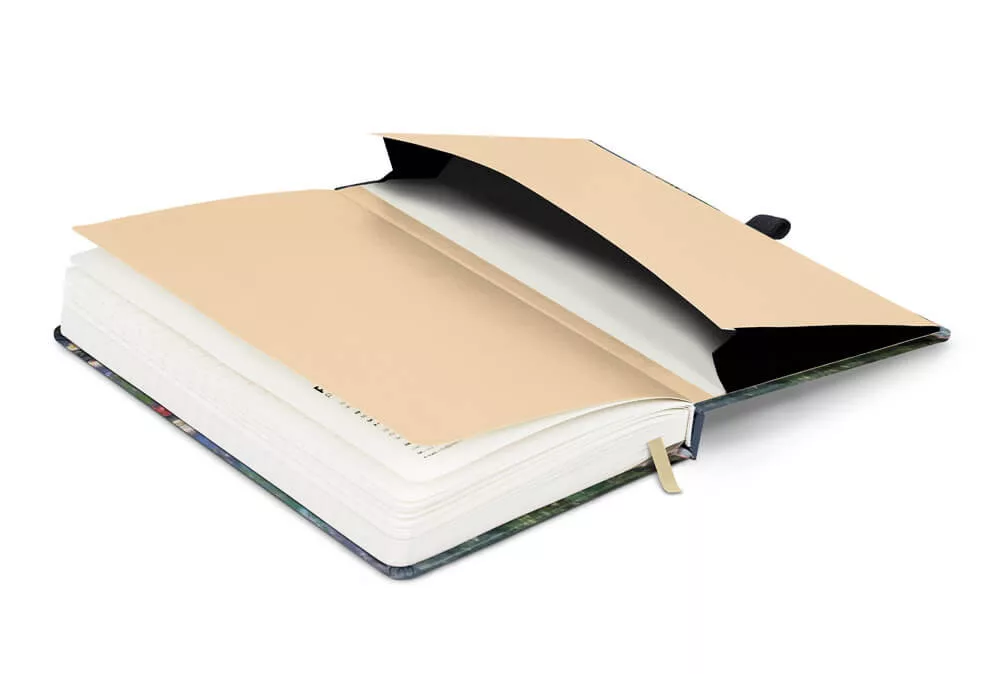 Keménytáblás notesz leszorító gumiszalaggal, egy belső zsebet tartalmaz. 172 krémszínű oldal. 100g-os papírral.