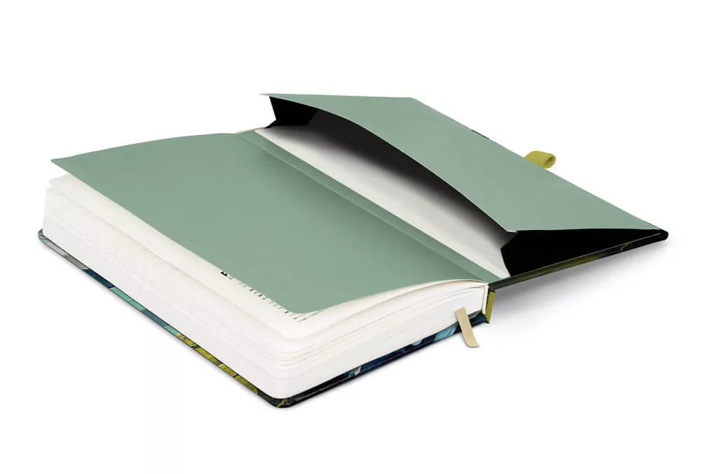 Keménytáblás notesz leszorító gumiszalaggal, egy belső zsebet tartalmaz. 172 krémszínű oldal. 100g-os papírral.