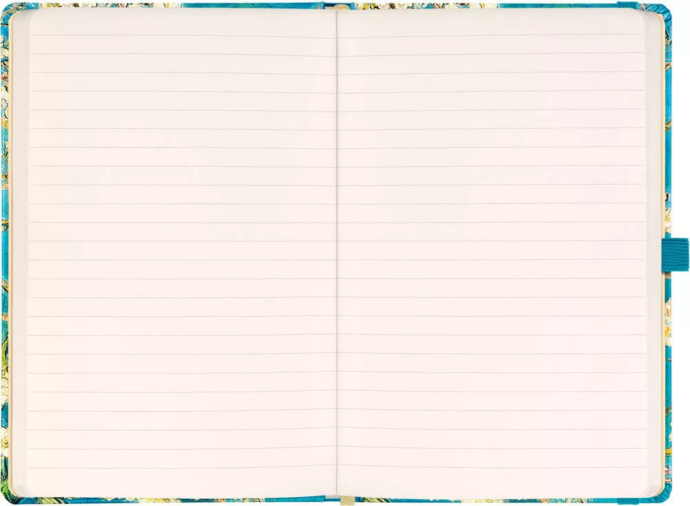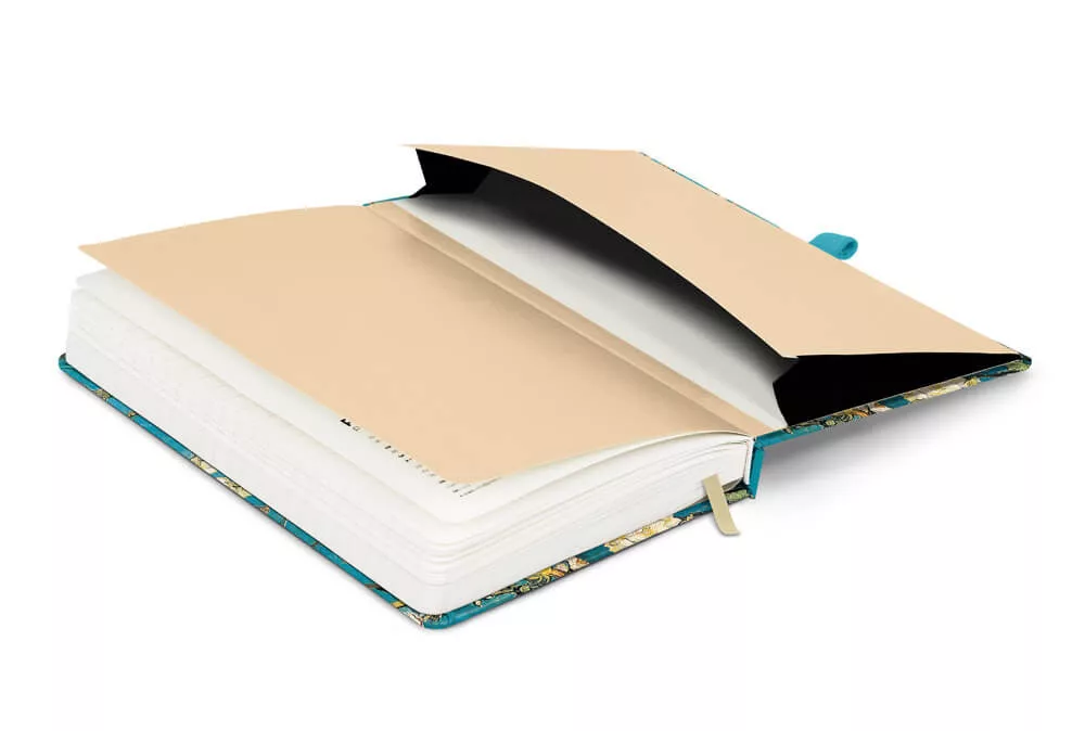 Keménytáblás notesz leszorító gumiszalaggal, egy belső zsebet tartalmaz. 172 krémszínű oldal. 100g-os papírral.