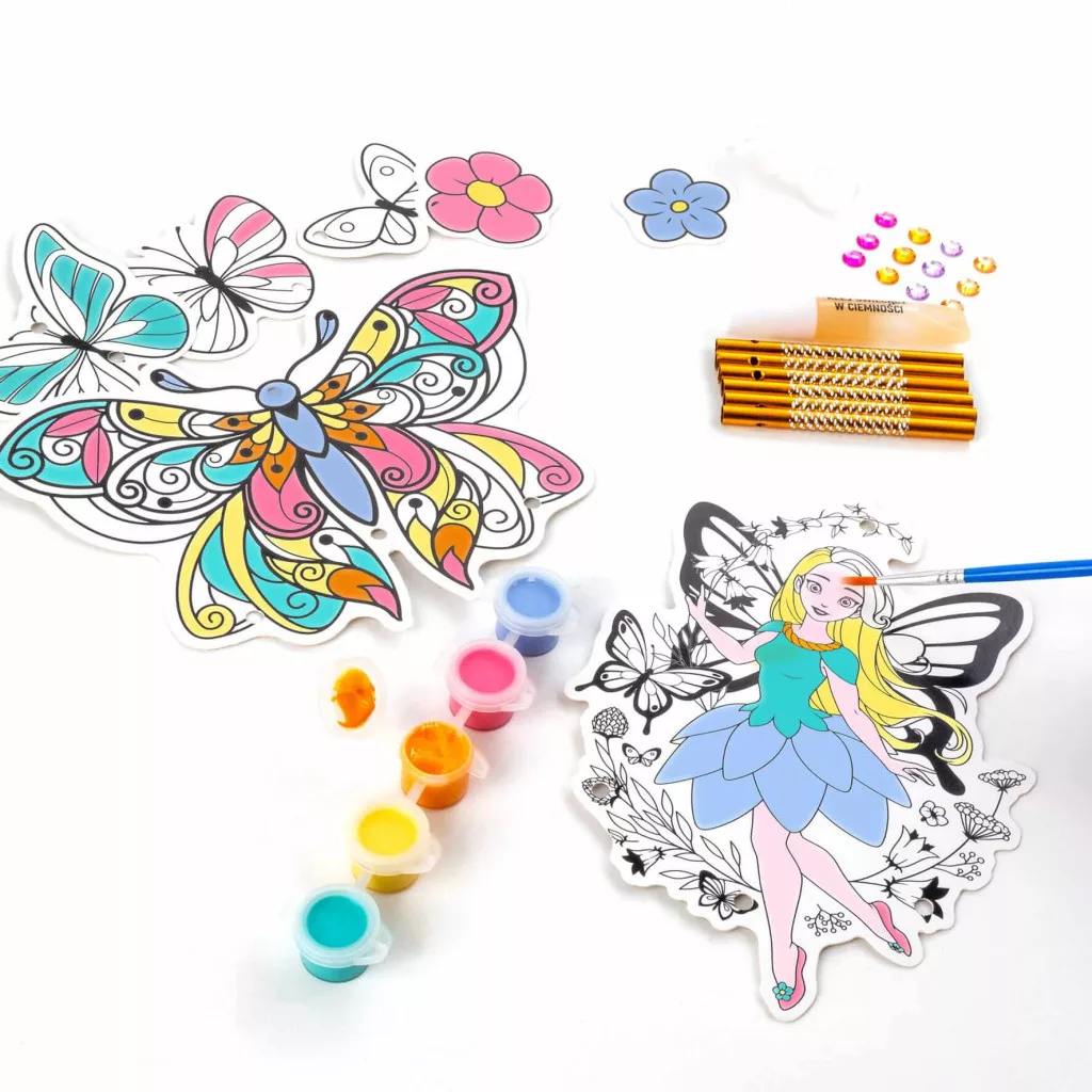 Varázslatos, sötétben világító szélcsengők. Tervezd meg saját szélcsengődet egy tündér és gyönyörű pillangók karton sablonjaival, mesebeli elemekkel körülvéve, amelyek gyönyörűen díszítik majd a szobádat. A készlet mindent tartalmaz, amire szükséged van egy lenyűgöző dekoráció elkészítéséhez. A teljes kreatív készlet tartalmaz 6 szélcsengőt, 12 strasszkövet, 7 karton sablont, 5 festéket ecsettel, sötétben világító gélt és zsinórt az összeszereléshez. A speciális sötétben világító ragasztónak köszönhetően a kész dekoráció varázslatosan világít sötétedés után, elbűvölő hangulatot teremtve a szobában. A készlet órákig tartó kreatív játékot garantál, a végeredmény pedig egy egyedi belső dekoráció.