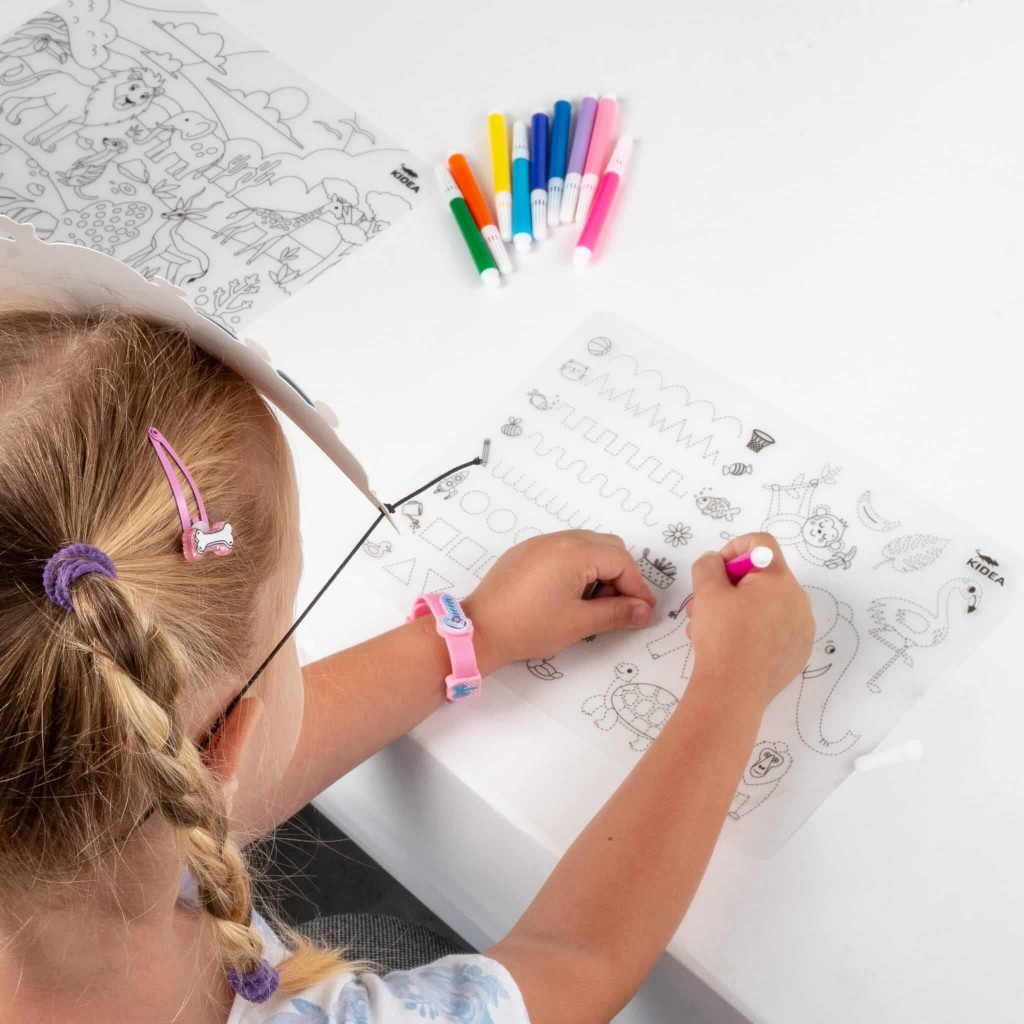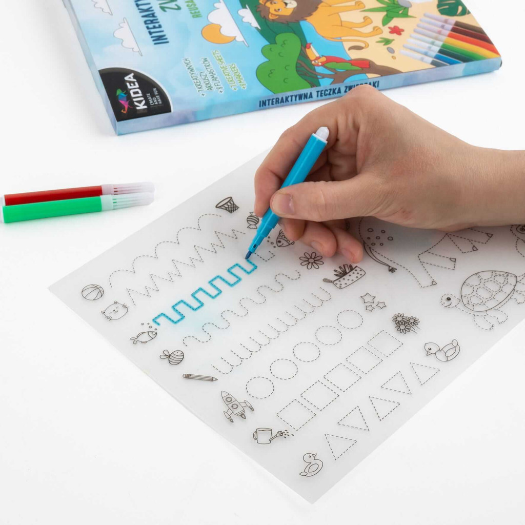 A készlet hat filcet tartalmaz egy praktikus tokban, valamint 7 ív foglalkoztató és színező lapot. Három speciális törölhető lap és négy színezhető papírlap kínál széleskörű lehetőségeket a rajzoláshoz, minták és az írás tanulásához és a finommotoros készségek gyakorlásához, valamint előrajzolt lapokat a színezéshez. Mindez egy tépőzáras záródású mappában. Tökéletes utazáshoz és kiváló alternatívája a hagyományos írószereknek.