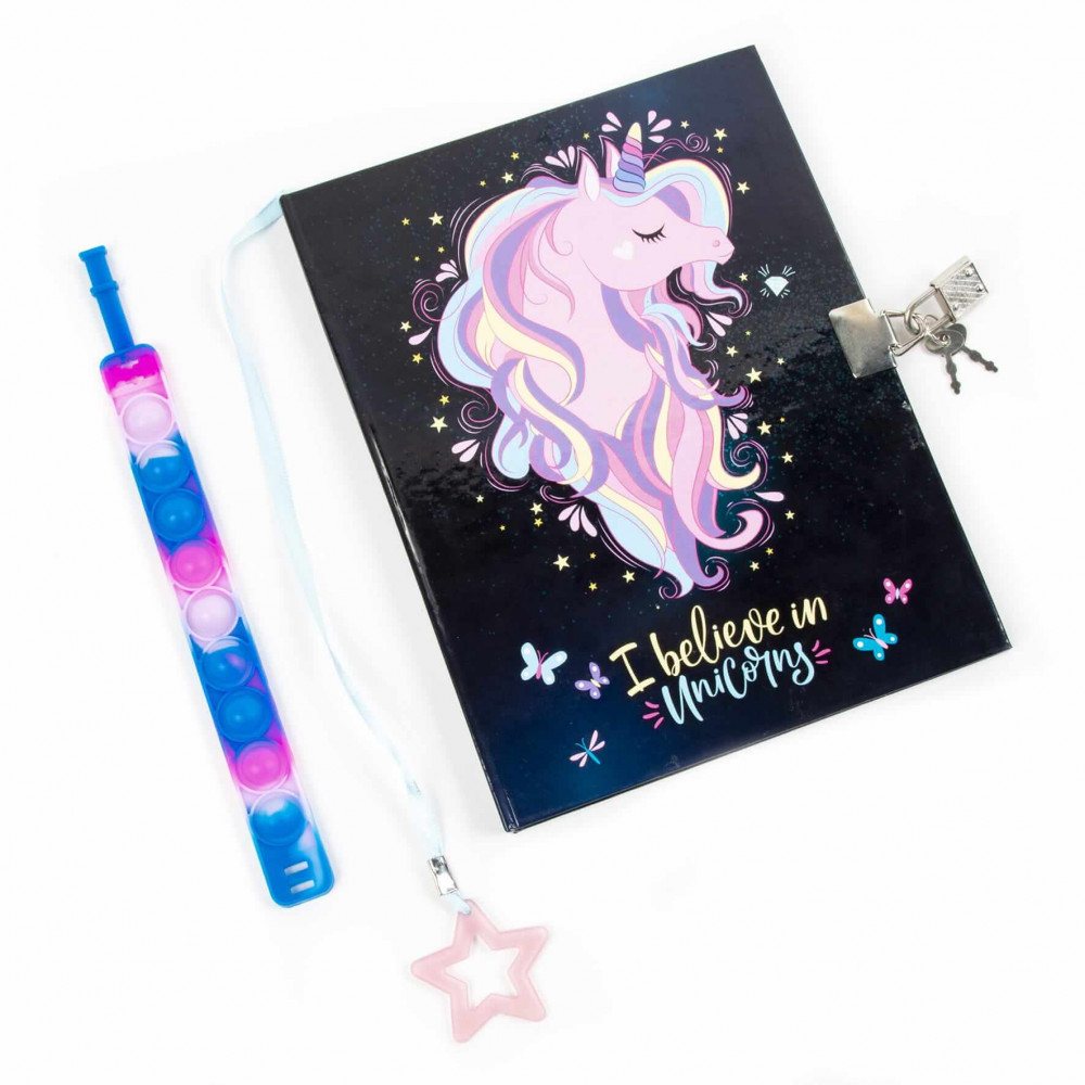 Unikornis napló kulccsal, 16,5x22cm, Pop it karkötővel, JR13